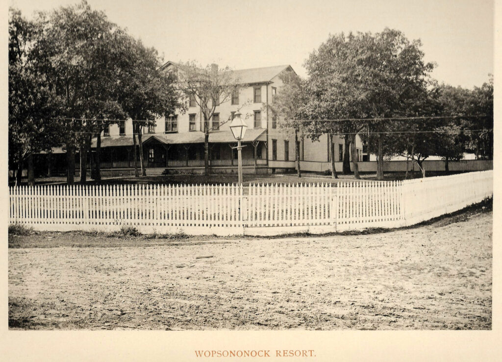 A rare historic photograph showing the grand front façade of the Wopsononock…