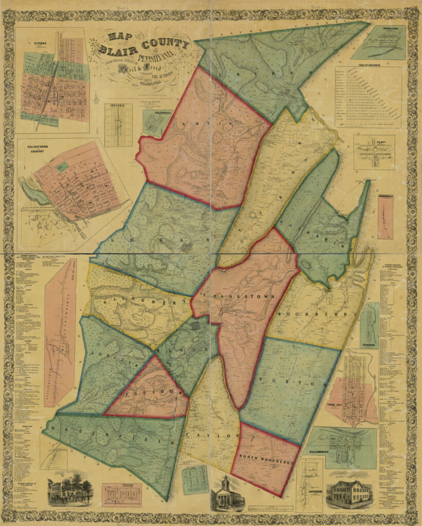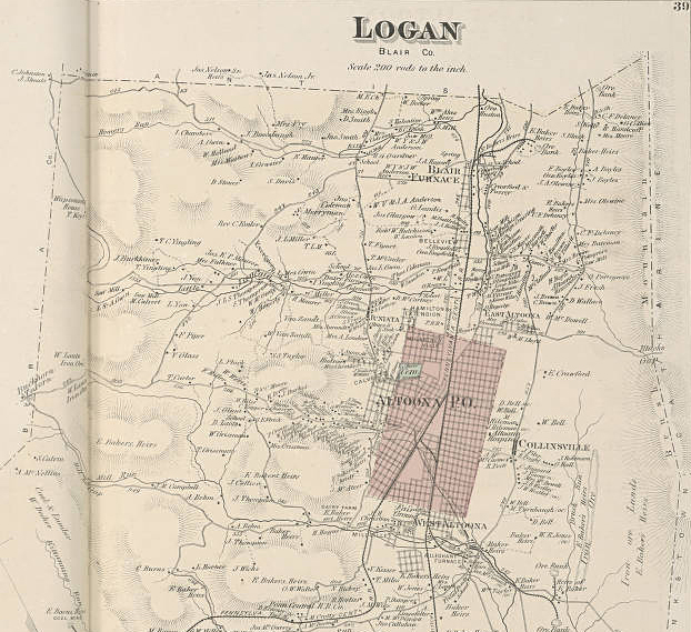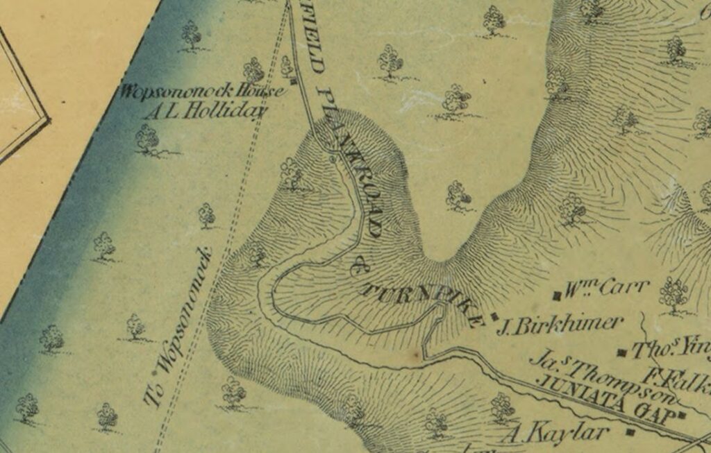 This 1859 map of Blair County shows the “Wopsononock House” owned by A. L. Holliday at the top of the windy Juniata Gap road.