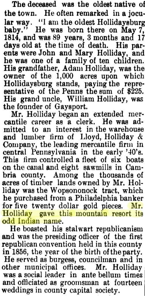 But in the obituary (Altoona Tribune, August 25, 1903) of Alexander Lowry Holliday, grandson of Adam Holliday, namesake of Hollidaysburg, PA, he is said to have given the Wopsononock area its name. A. L. Holliday once owned what was called the “Wopsononock Tract,” over 400 acres of mountain land.