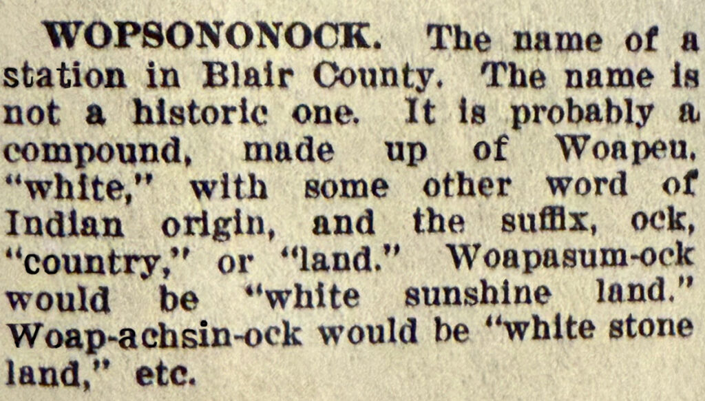 Origins of “Wopsononock” as a place name are mixed and not definitive, but it is a unique name not appearing elseware.