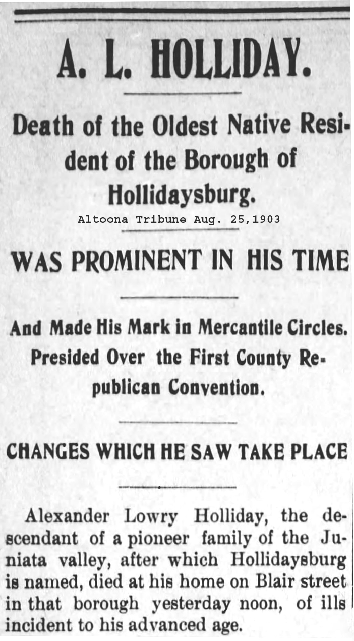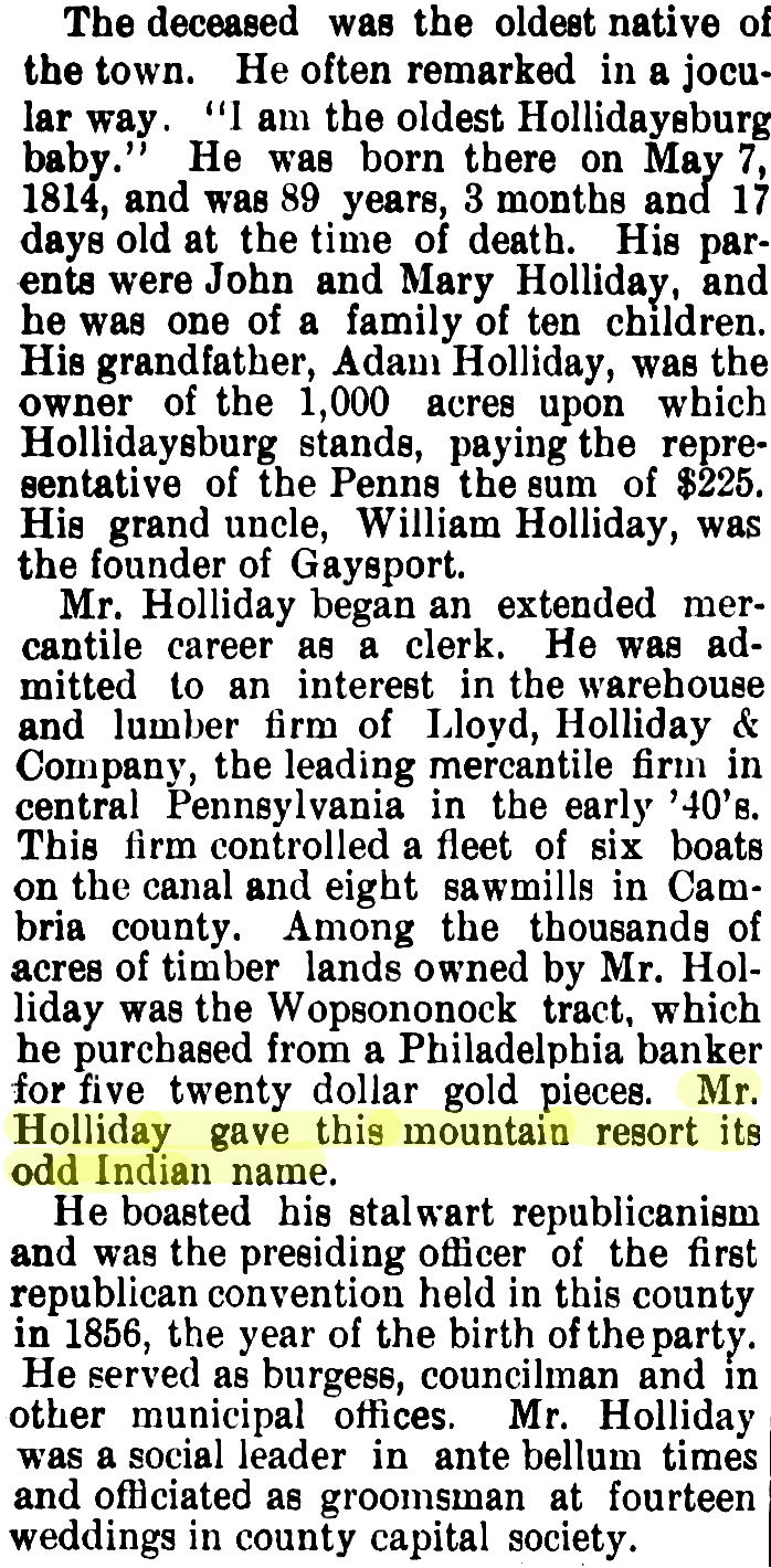 But in the obituary (Altoona Tribune, August 25, 1903) of Alexander Lowry Holliday, grandson of Adam Holliday, namesake of Hollidaysburg, PA, he is said to have given the Wopsononock area its name. A. L. Holliday once owned what was called the “Wopsononock Tract,” over 400 acres of mountain land.