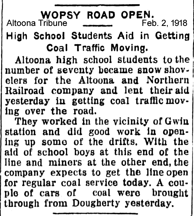 Altoona high school students had been used to clear the tracks of snow so that coal service from Dougherty to Altoona could be resumed.