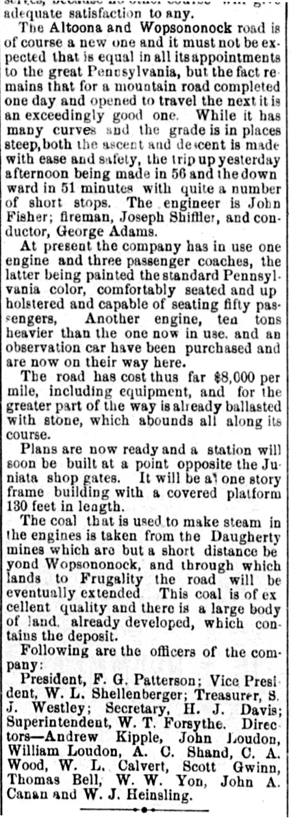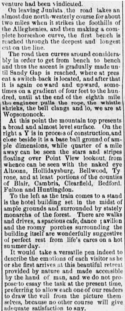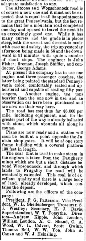 After months of planning and construction, the narrow-gauge Altoona & Wopsononock Railroad made its first trip to the summit on June 11, 1891. Leaving Juniata at about 8:00 a.m. with only some fifteen passengers aboard, the train headed west along Spring Run before turning directly toward the mountain.