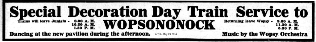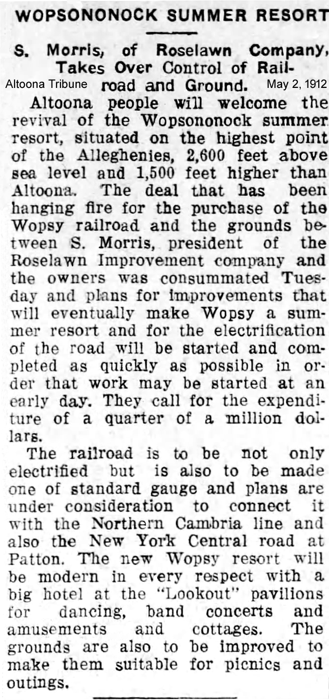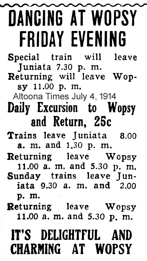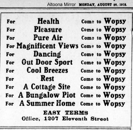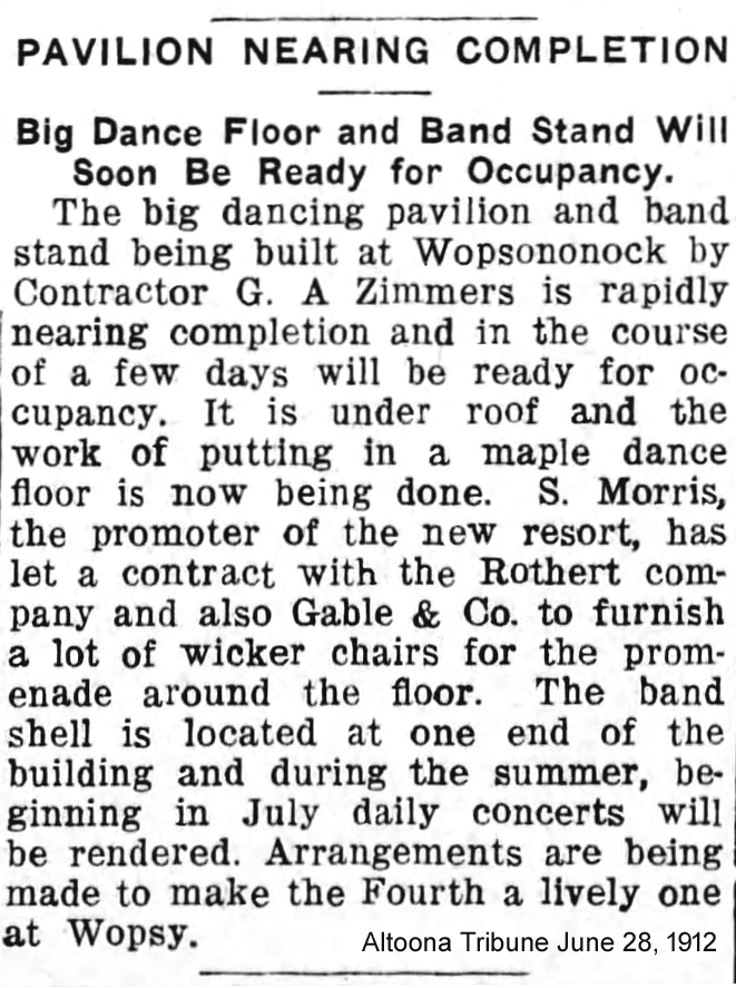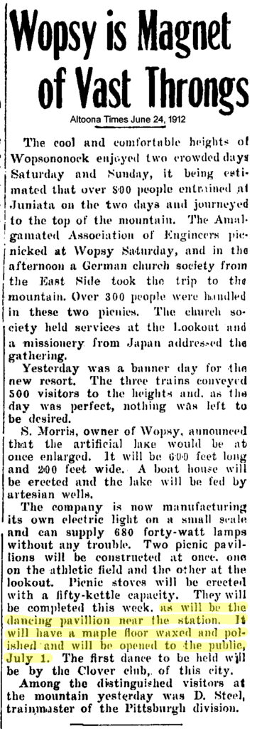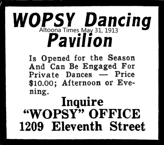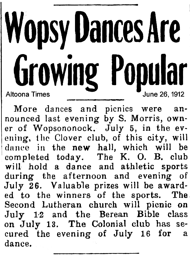In a May 8, 1912 article in the Altoona Tribune, plans were detailed for extensive improvements to the Wopsononock Resort area following the purchase of the mountaintop property by Sigmund Morris. Among the proposed additions was a dance pavilion, and throughout the remainder of 1912 and the subsequent few years, local newspapers ran frequent advertisements promoting upcoming dances at “Wopsy.”