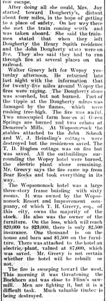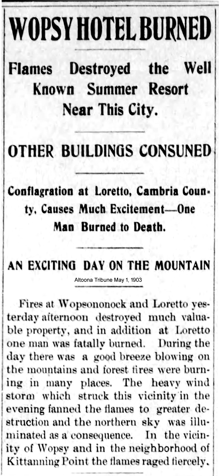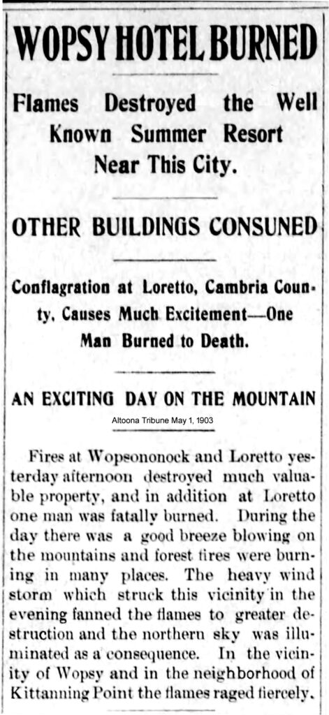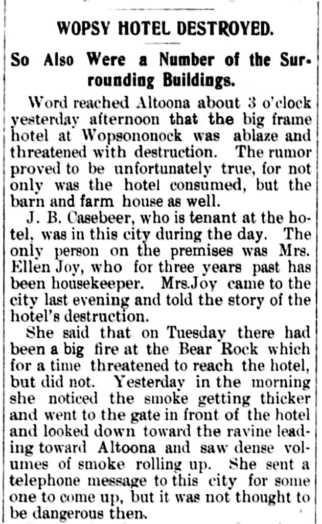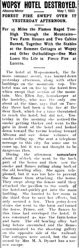 In late April 1903, forest fires raged at several locations on Wopsononock Mountain and throughout parts of Cambria County. Earlier in the week, according to Wopsononock Hotel housekeeper Mrs. Ellen Joy, strong winds had kept the fires safely away from the hotel.