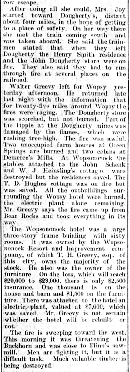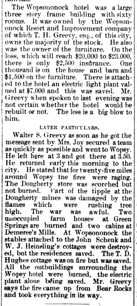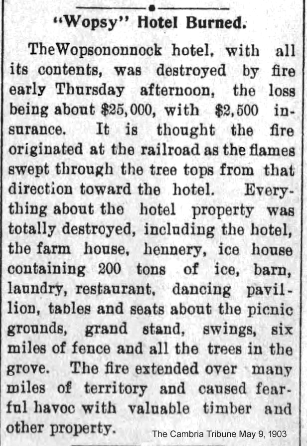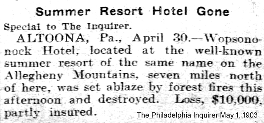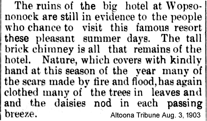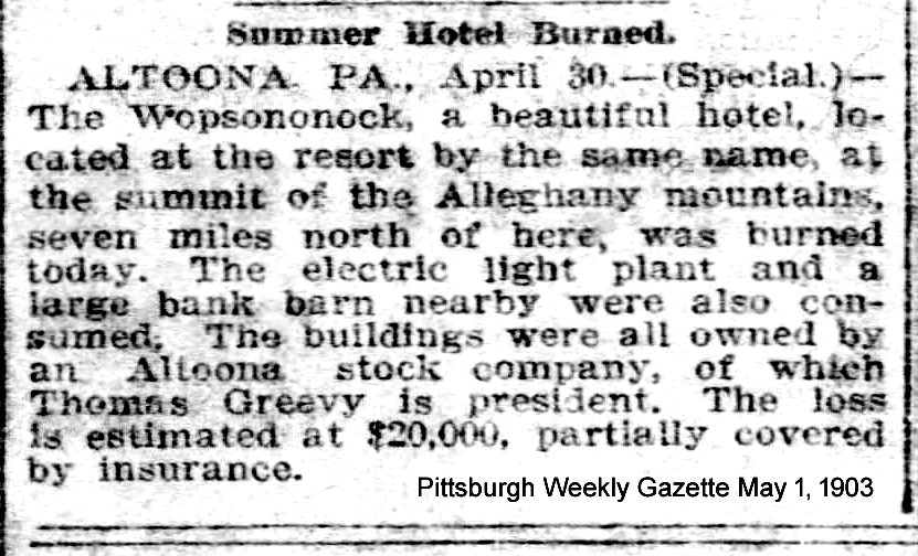 Contemporary news accounts reported that the loss exceeded $20,000, while the hotel was insured for only $2,000. The Wopsononock Hotel was never rebuilt. A detailed account of the disaster appeared on the front page of the Altoona Tribune on May 1, 1903.