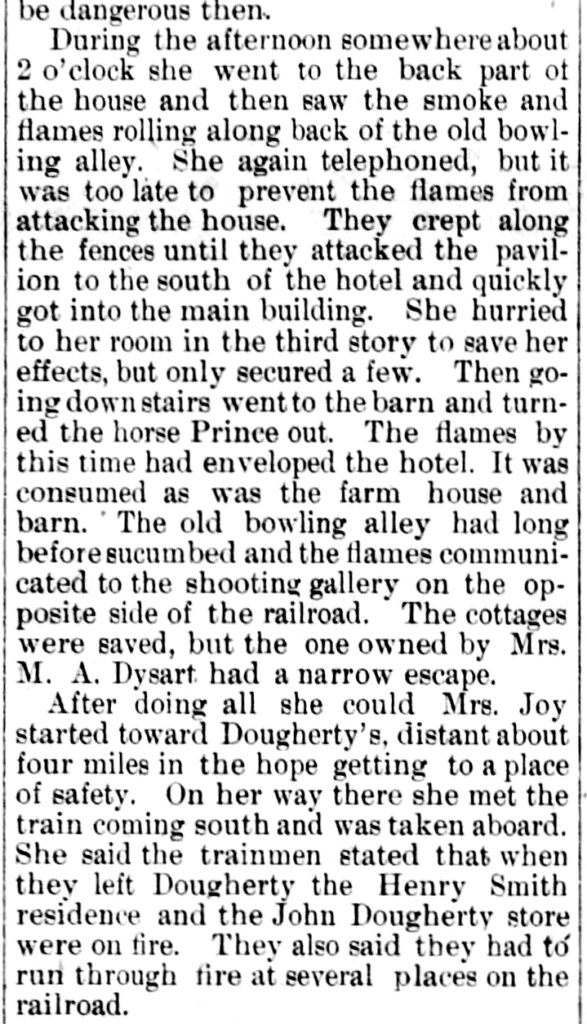 On April 30, 1903, however, while Mrs. Joy was once again alone at the hotel—which had not yet opened for the 1903 tourist season—the winds suddenly shifted. Flames reached the rear of the fourteen-year-old structure. Mrs. Joy immediately telephoned for assistance, but the fire had already advanced too far. Within a short time, the blaze completely destroyed the well-known mountain landmark.
