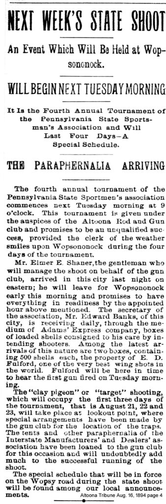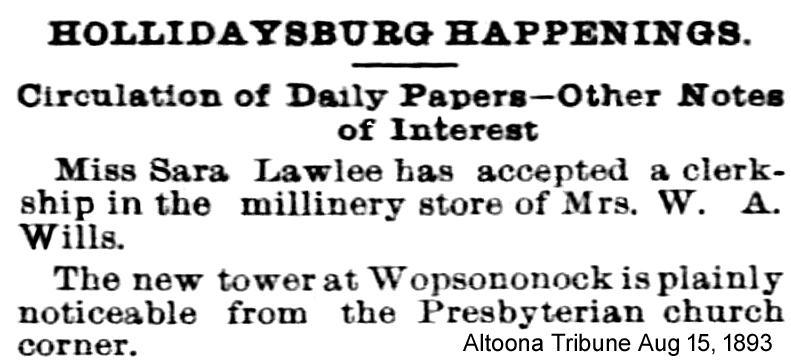 The Lookout quickly became one of Wopsononock’s most popular attractions. Even after the Wopsononock Hotel was destroyed by a forest fire in 1903, the tower continued to draw visitors for several more years. As railroad travel from Juniata to the summit of Wopsy declined sharply, however, maintenance of the wooden structure became minimal. The upper levels blew down during a storm around 1910 and then, for safety reasons, the lower levels were eventually removed.