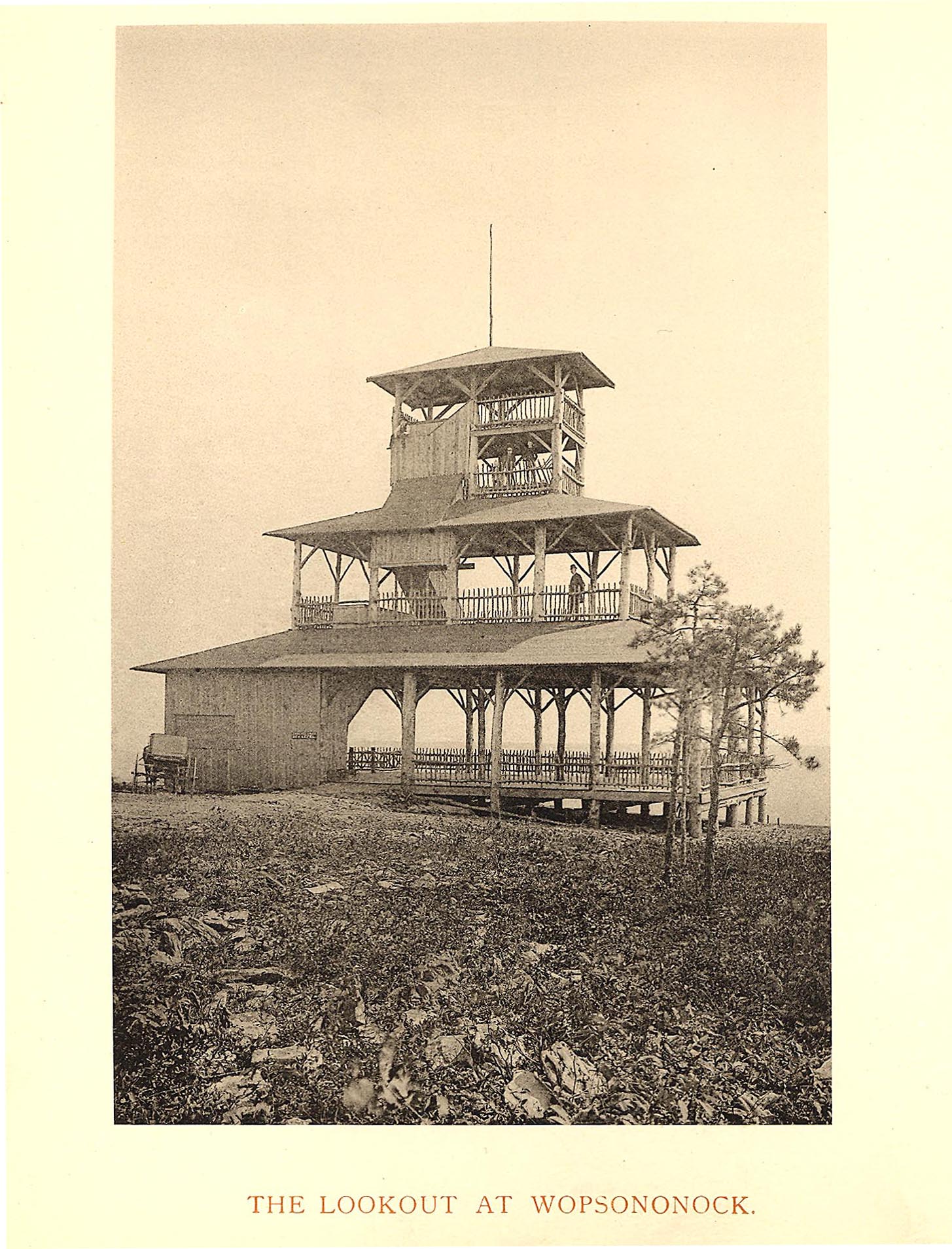 The Wopsononock Lookout Tower was constructed sometime during the summer of 1892. Standing forty feet high and containing four levels, the tower offered commanding views of the surrounding countryside. It was said that from the top platform, visitors could see into six different Pennsylvania counties. A wooden walkway connected the beginning of Lookout Avenue with the tower, making it easily accessible to guests at the mountaintop resort.