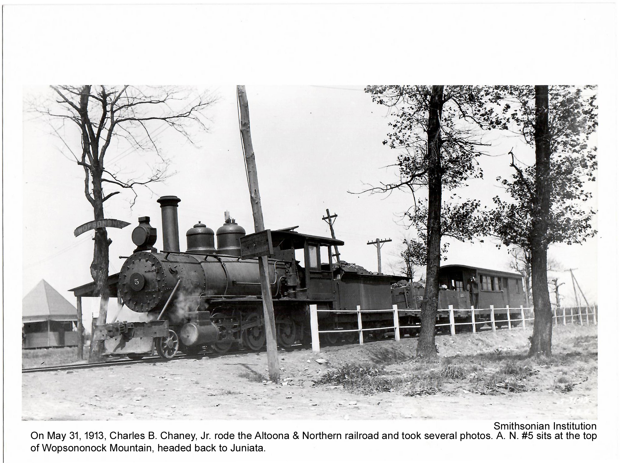 At this point, I no longer recall how I obtained Rev. Adams’s contact information, but we exchanged several letters through the mail, long before the days of Google and email. In one of his letters, Rev. Adams provided me with the address and negative numbers for photographs of the Wopsononock Railroad taken locally in 1913 by Charles B. Chaney, Jr.
