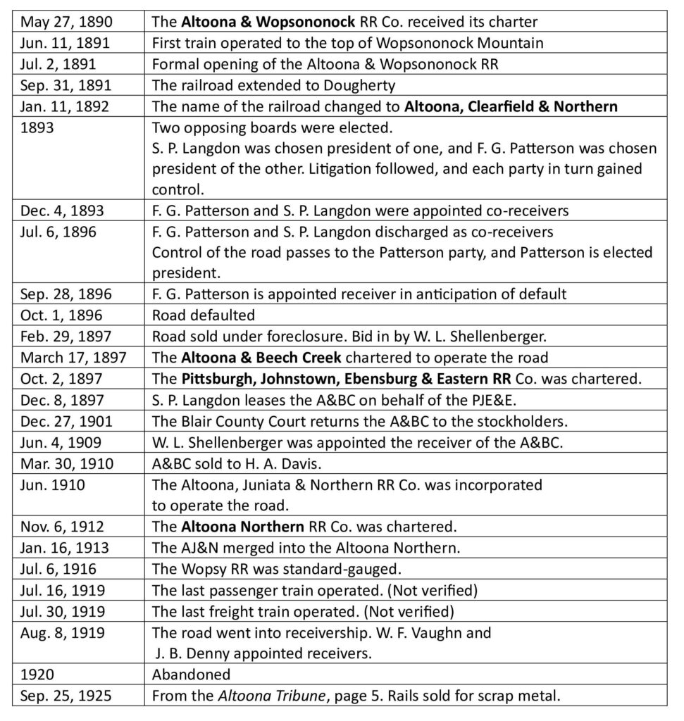 Whatever its “official” name, locals around Blair County affectionately referred to it as the Wopsy Railroad. Below is a Wopsy Railroad Timeline from its charter date in 1890 until the rails were removed to sell as scrap in 1925.