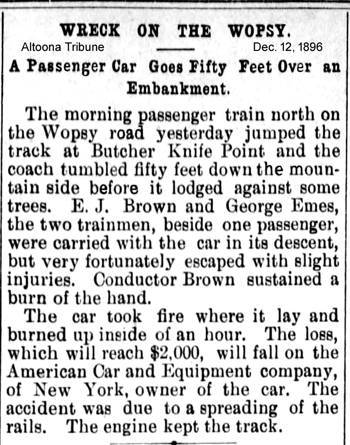 An article from Altoona Tribune, December 13, 1896 describes a wreck on the Wopsy line where a passenger car tumbled 50 feet down the slope with three people onboard, but no major injuries.